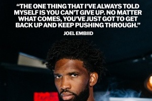 在照片上,附有恩比德的一段话:“我一直告诉自己的一件事就是,你不能放弃。无论遇到什么,你都必须重新站起来,坚持下去。”